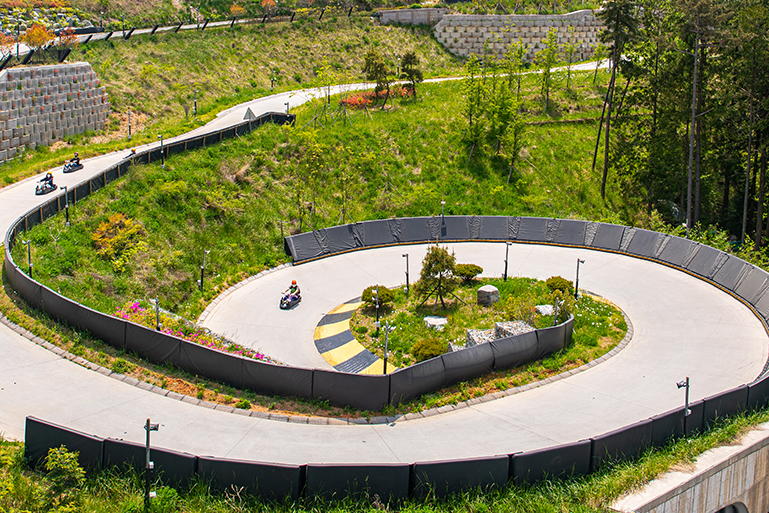 특별한 동력장치 없이 특수 제작된 카트를 타고 땅의 경사와 중력만을 이용해 트랙을 내려오는 다이나믹한 체험 레포츠시설로 방향조정과 제동이 가능하며, 어린이부터 어른까지 누구나 즐길 수 있는 무동력 바퀴 썰매입니다.